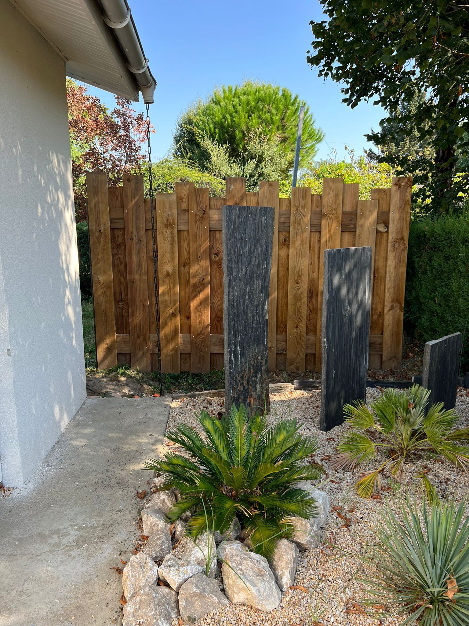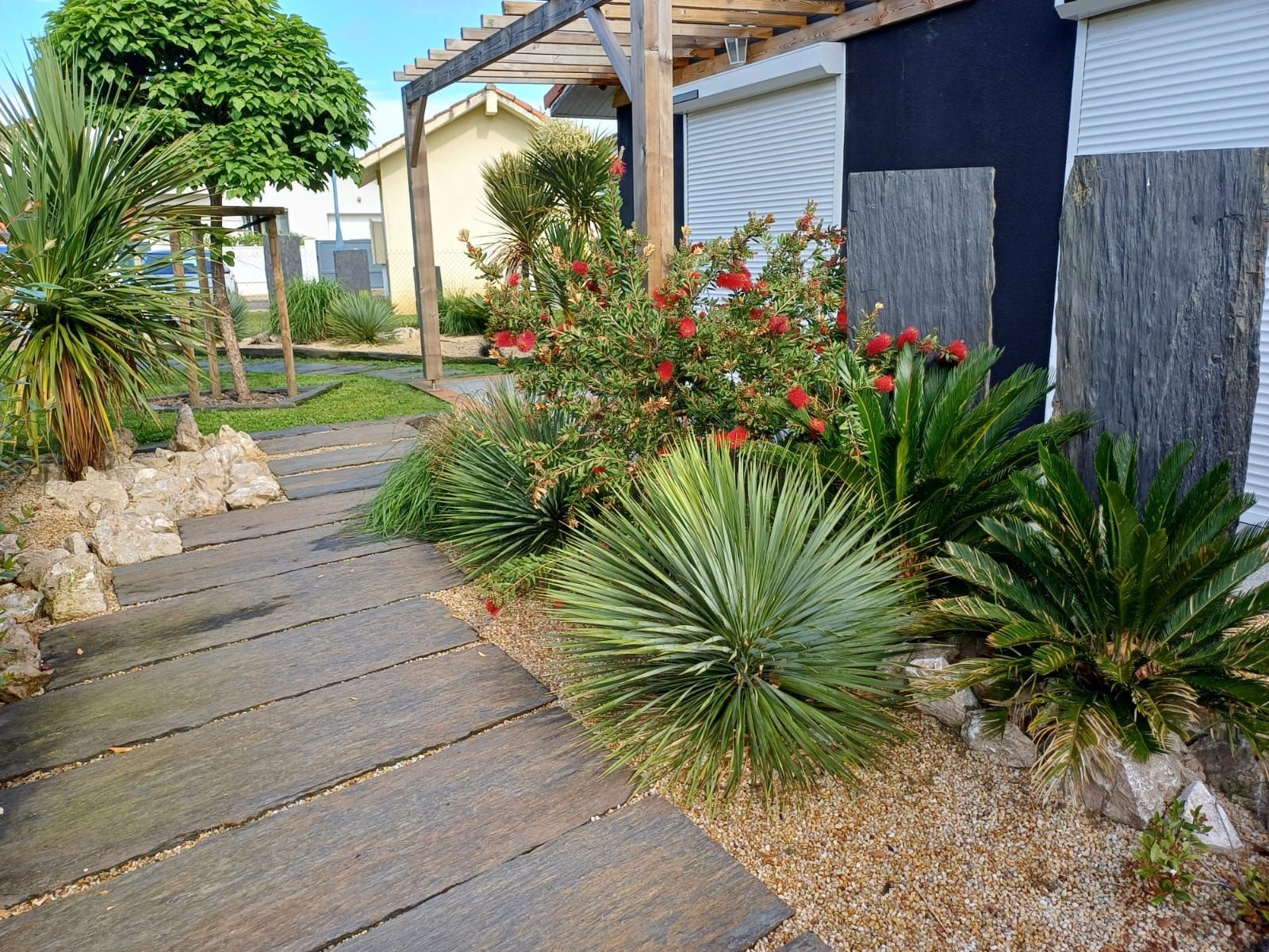 - Plantations diverses, avec intégration de dalles d'ardoise à la verticale pour apporter des volumes et hauteurs différentes