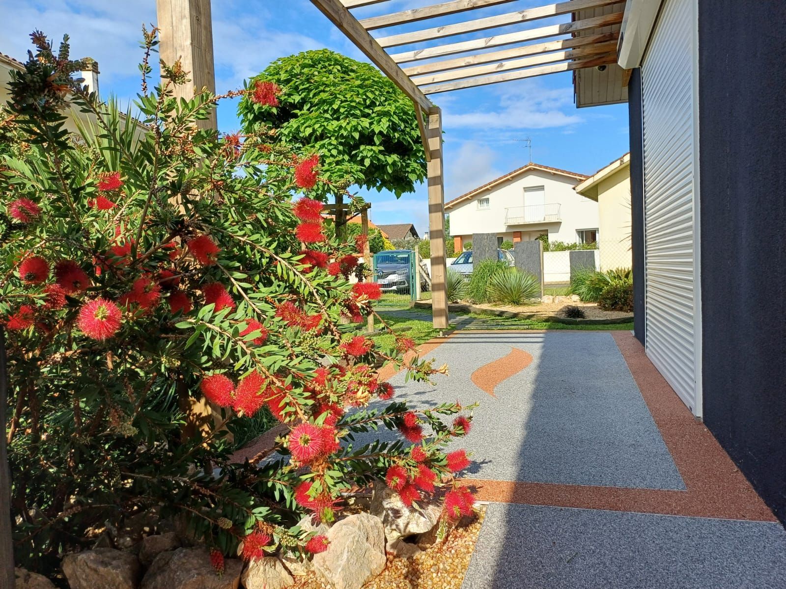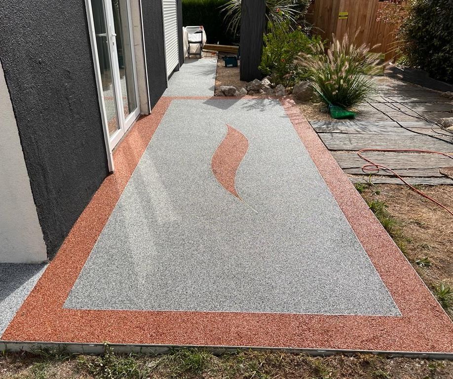 - Terrasse et entrée en résine drainante, avec incrustation de motifs